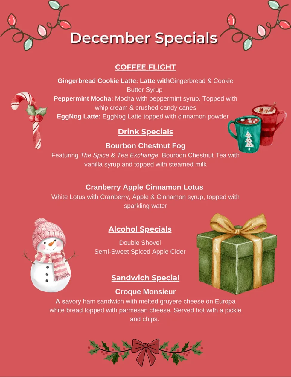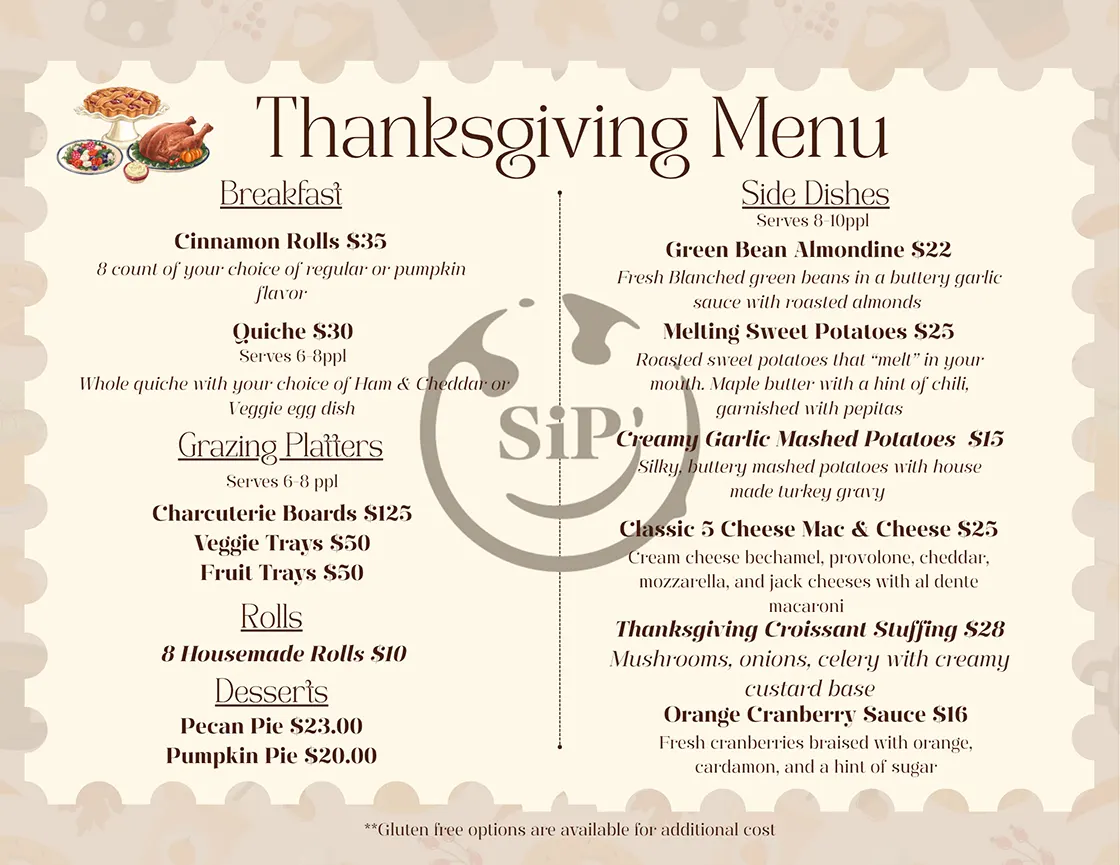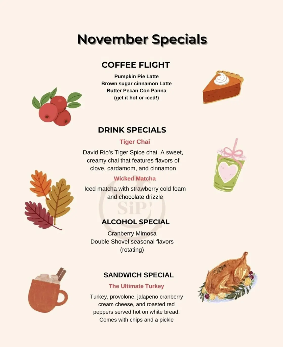 We started out as Sip Coffee Lounge and have expanded our menu into wine and beer as well. We also offer a variety of menu items including Redbull sodas and Lotus.