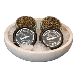 Produced in limited quantities, Tsar Nicoulai’s Reserve caviar features large, tawny-brown to platinum beads with a light, nutty, and buttery flavor. Each tin offers an elegant balance of texture and taste, making it a favorite among chefs and caviar lovers alike.